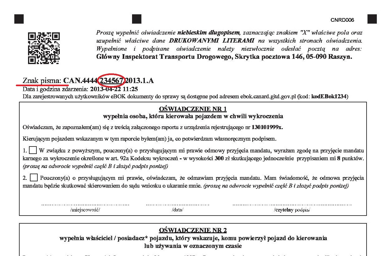 uprzejmie informujemy, że od kwietnia 2014 roku przed połączeniem z pracownikiem Centrum Automatycznego Nadzoru nad Ruchem Drogowym GITD możliwe będzie podanie środkowej części znaku pisma (zgodnie z przedstawionym na zdjęciu wzorem CAN.4444.234567.2013.1.A). Wprowadzenie zaznaczonej części znaku pisma pozwoli na sprawniejszą obsługę Państwa zgłoszeń oraz spowoduje skrócenie czasu oczekiwania na połączenie z pracownikiem.
